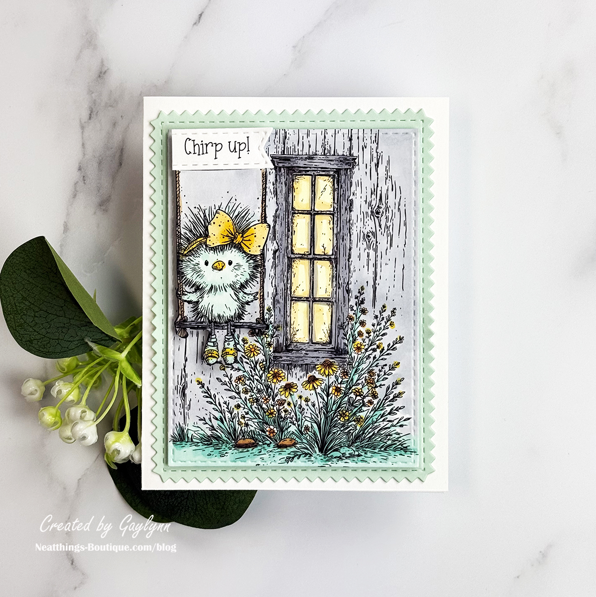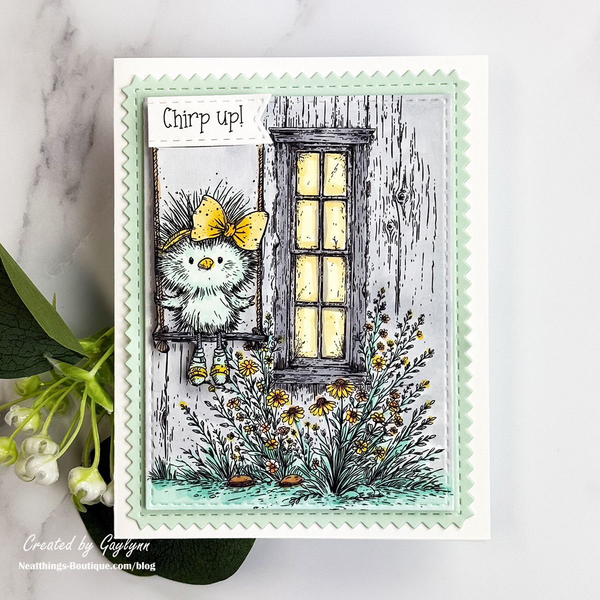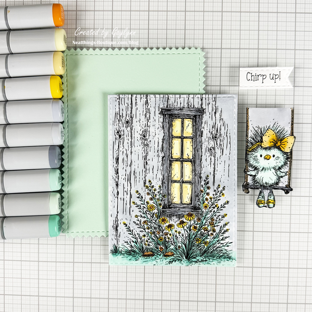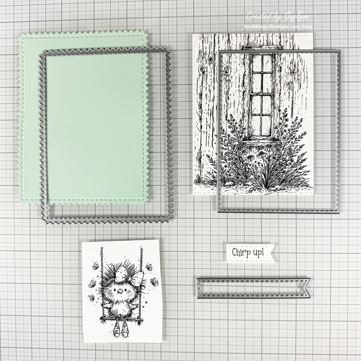 Hey there, friends. Welcome to my blog, it's Gaylynn. Today I am pairing bird and barn stamps to create the sweetest card scene. The combination creates easy card making. Try searching your stash for complementary stamps or icons. You may be surprised by what you come up with to create fantastic card scenes. To create this card, I used stamping, Copic marker coloring, fussy cutting and die-cutting. The featured products are from Chirp Up stamps plus the Background of the Month for March 2026 or the one-time purchase of The Ol' Farmhouse Window. I have included the project steps, a short video and supplies below.