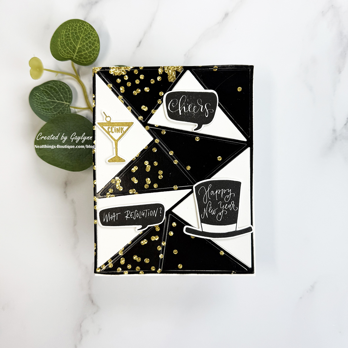 Happy New Year friends. Welcome to my blog. Here's wishing you and yours the very best in the New Year. Today's project features festive celebration greetings and icons to ring in the new year. For the focus of this project, I used the Resolutions rubber stamps & dies plus the pack of Resolutions 6x6 patterned paper. The full supply list is below.