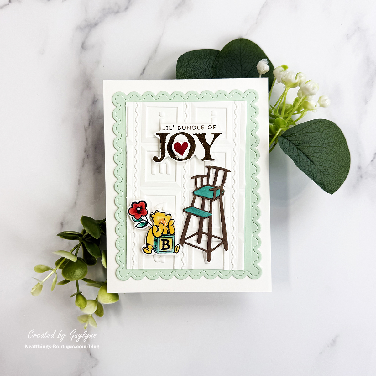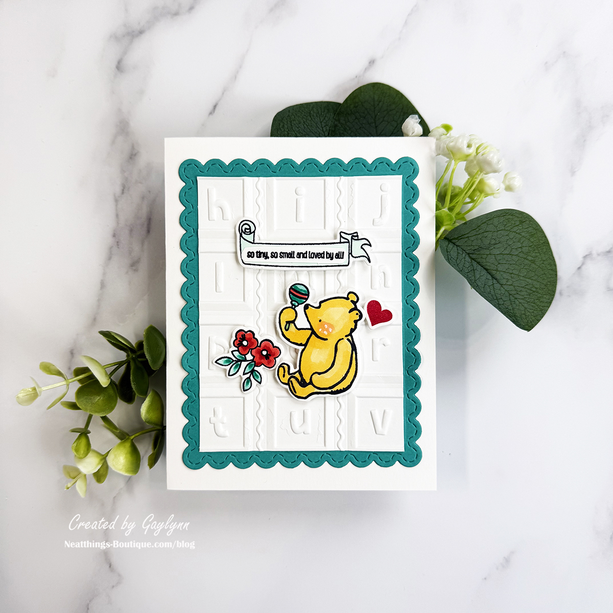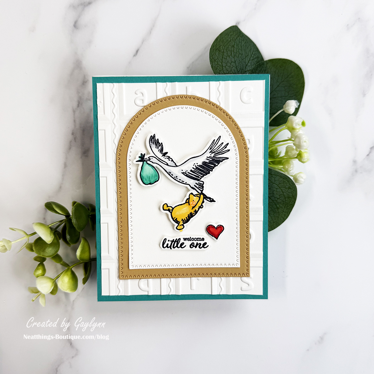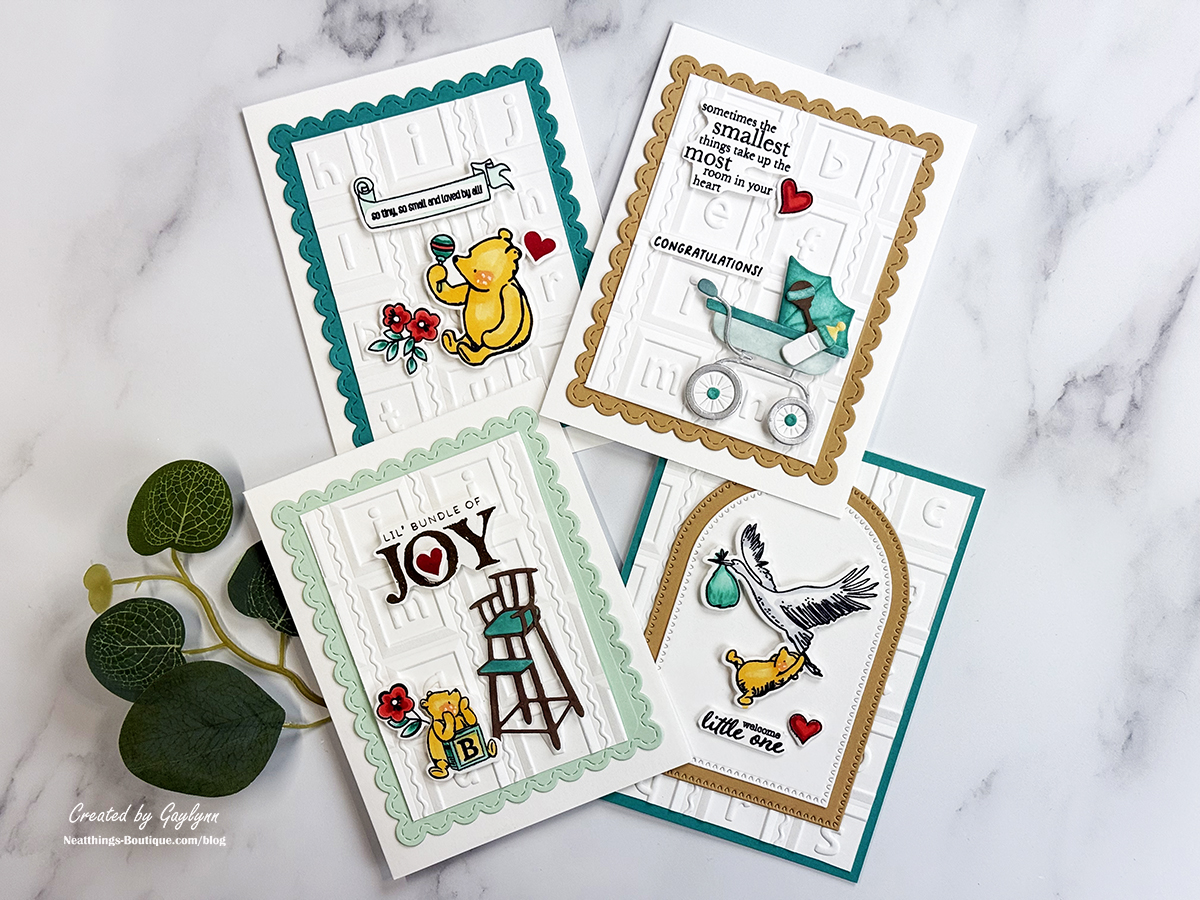 Welcome to my blog. I'm Gaylynn. Let's make four coordinating cards with the same theme. When you have a coordinating collection of products in the theme you want, it makes for easy and quick card making. Grab coordinating themed stamps, dies, cut files, embossing folders, or sentiments in your theme to make multiple cards with me. My example today is baby-themed. I used different products from the Say Cheese Classic Pooh Baby Collection. Some of the techniques that I used to create these cards are stamping, coloring, ink blending, 3D embossing and die-cutting. I included the project supplies and a video below. As always, use what you have to make similar cards.
