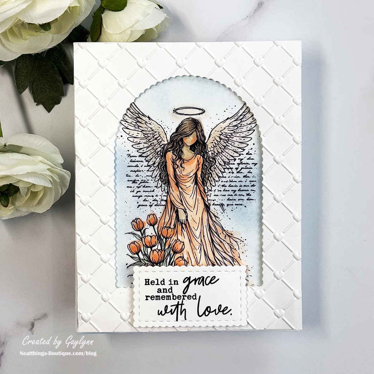 Greetings and welcome. Here. I share how to make your own handmade cover frame for card making. This is simple and adds beautiful focus and a faux window effect. The featured Unity Stamp Company stamp and sentiment are from Angel of God stamps. To create this card, I used rubber stamping, ink blending, Copic marker coloring, dry embossing and die-cutting. I included the project steps, video and supplies below.