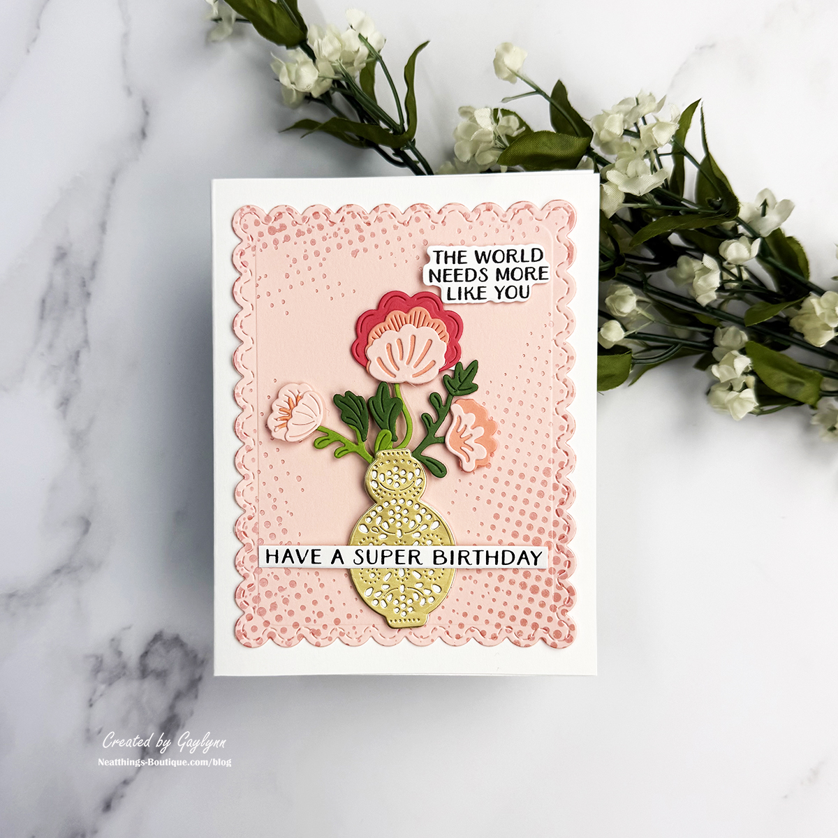 Next up is a feminine card using the background from Edge Effects press + foil plates.