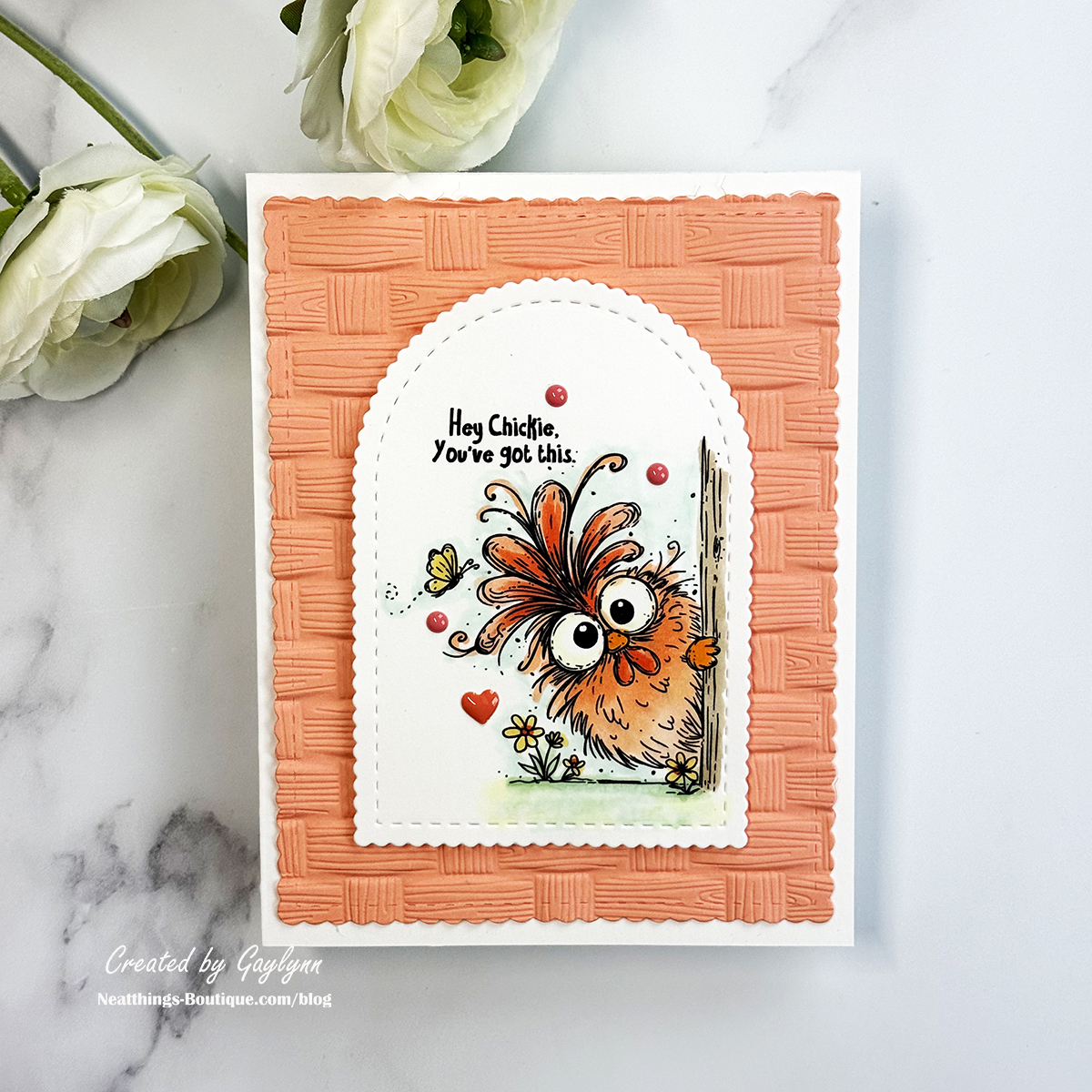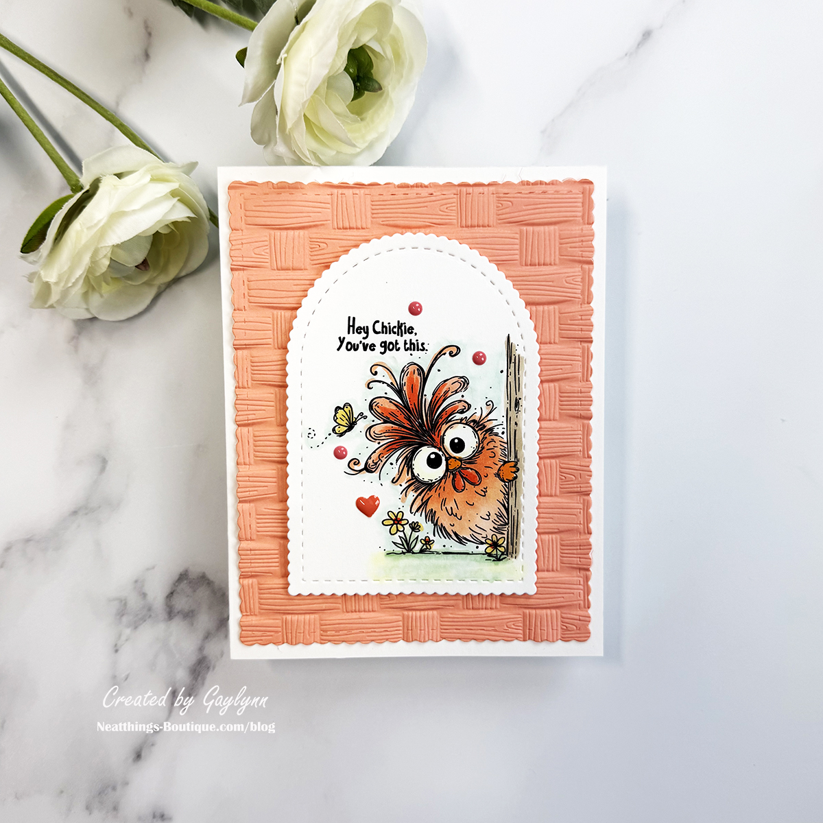 Stamp the chicken and the sentiment near each other, then die-cut the scene using small arch dies.