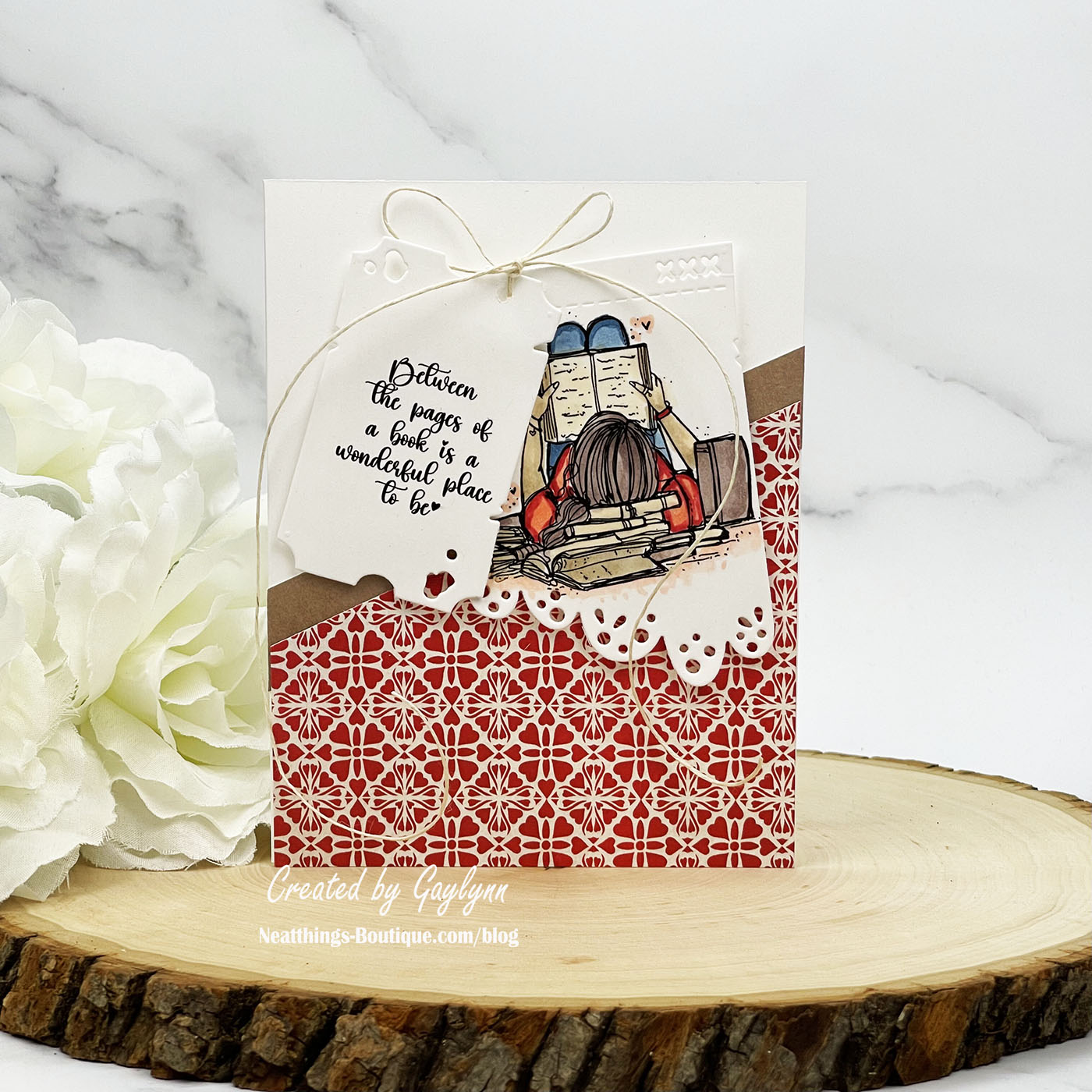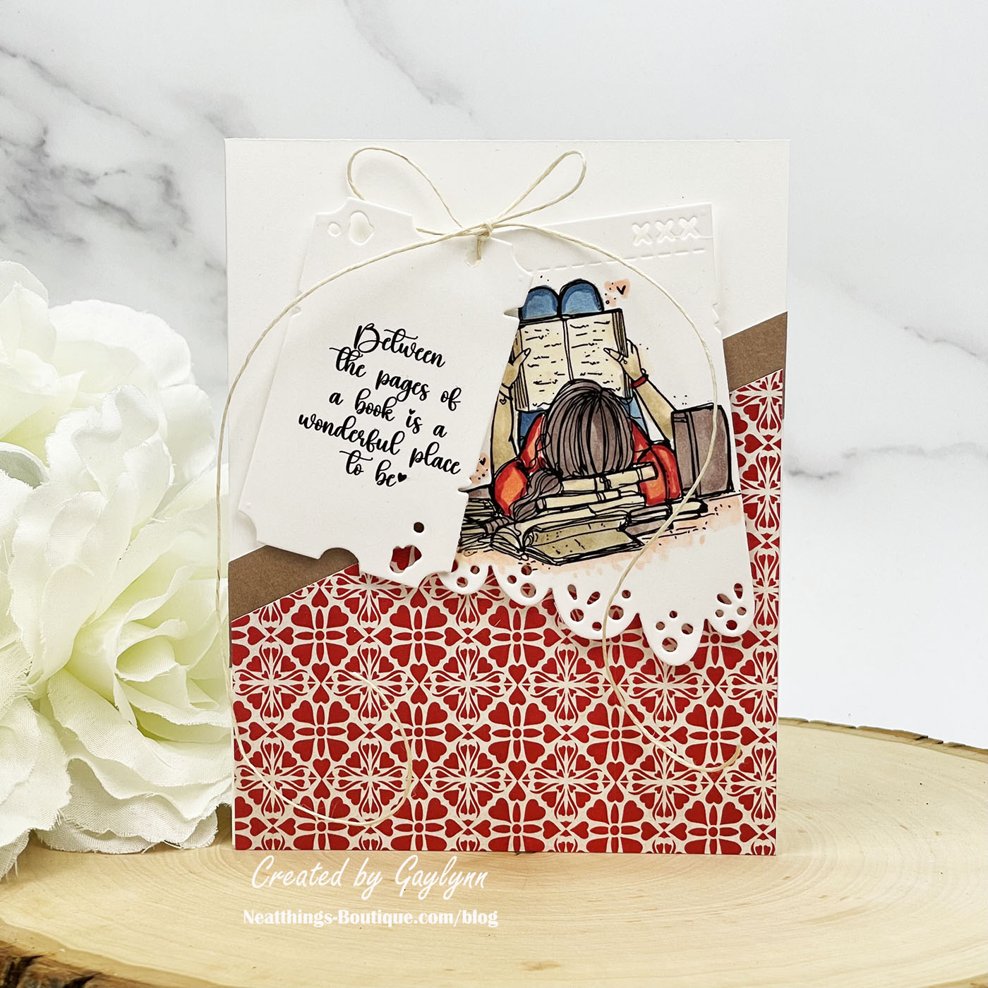 Hi there. Welcome. This is an easy card made by using a stamped book themed girl reading plus die-cut tags and patterned paper. I added Copic marker coloring for the girl for a pop of color. Use the color medium that you have on hand. Below are helpful tips and steps for making this book themed tag card. The supplies for this project are linked below.