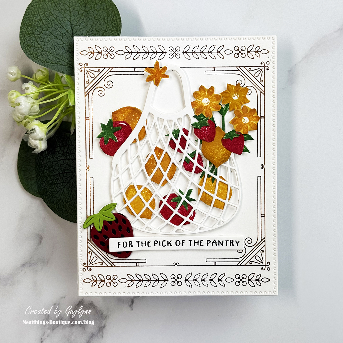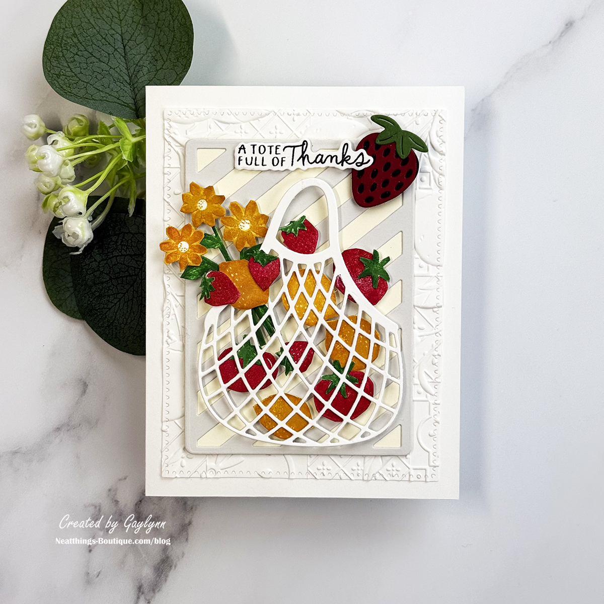 Stamp the fruits and vegetables and the sentiments, then die-cut the mesh bag & sentiments from the Clear Stamp and Die of the Month April 2026.