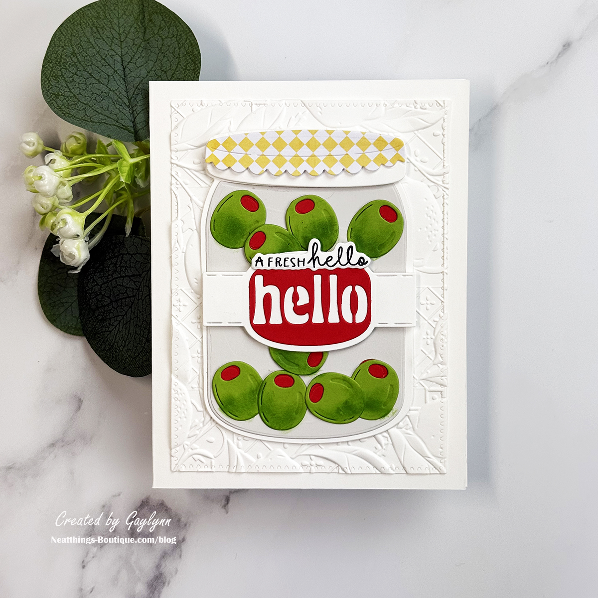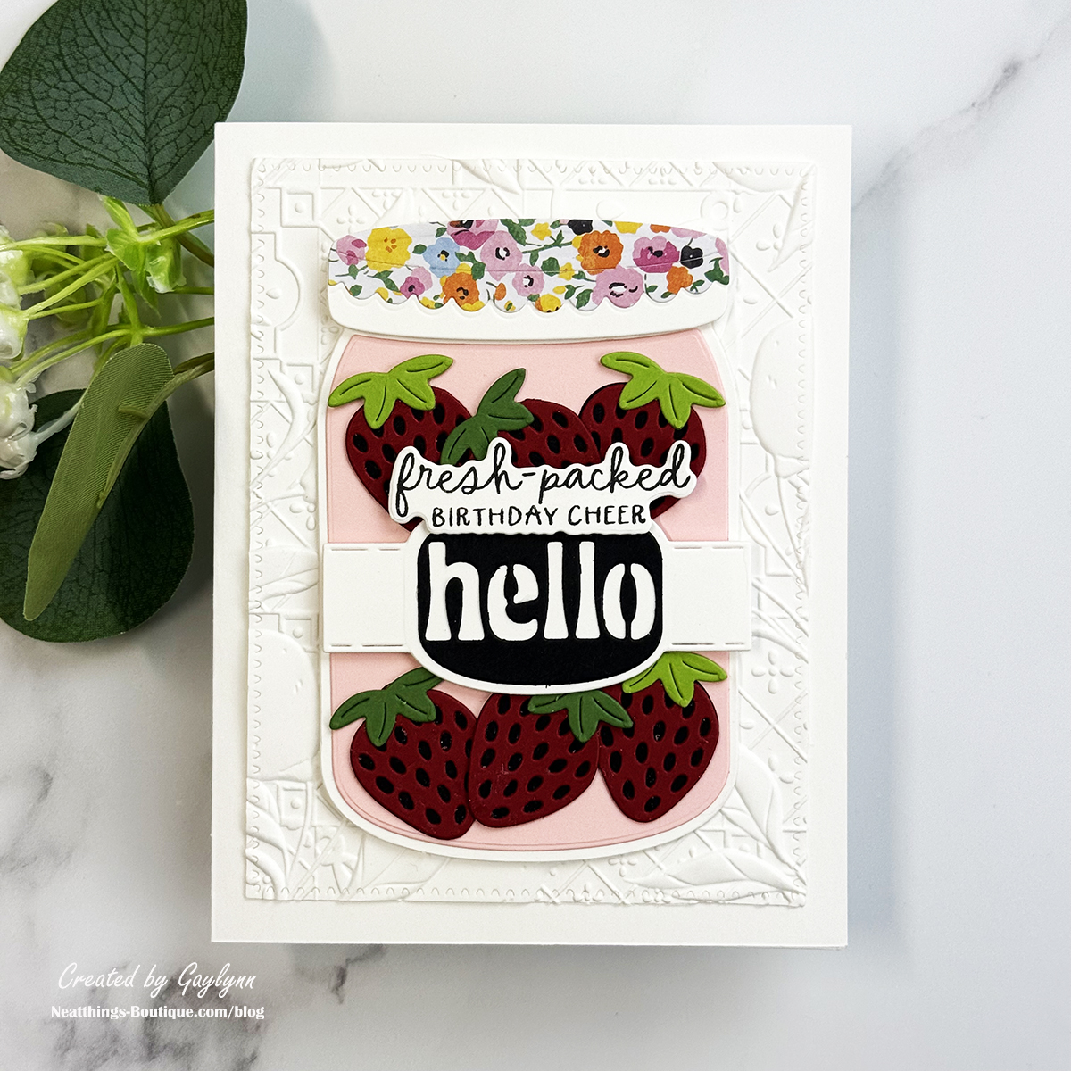 From one of the All Clubs Crate April 2026 bonus items, die-cut three jar sets and three sets of canning pickles, olives and strawberries. Add a touch of ink blending, optional.