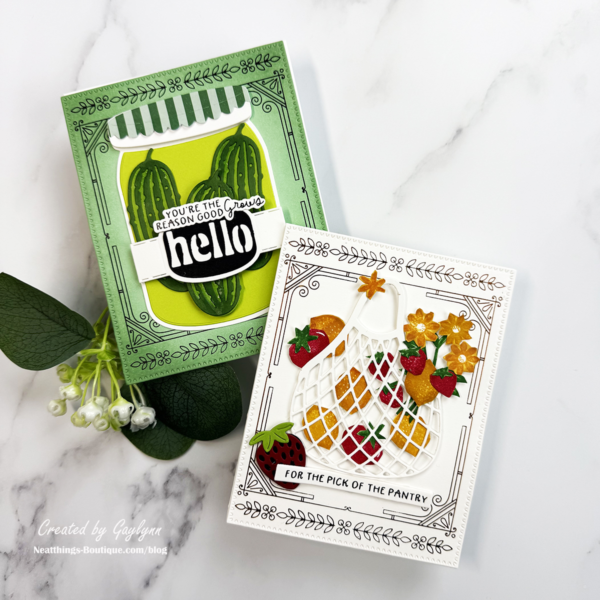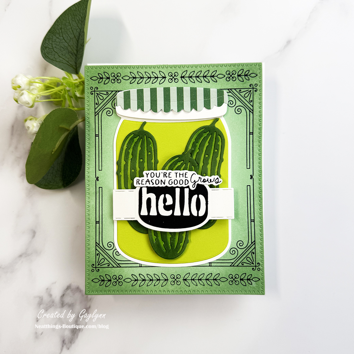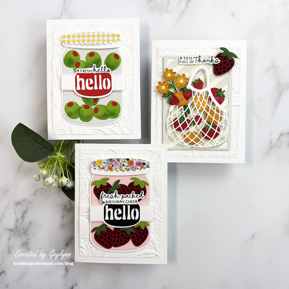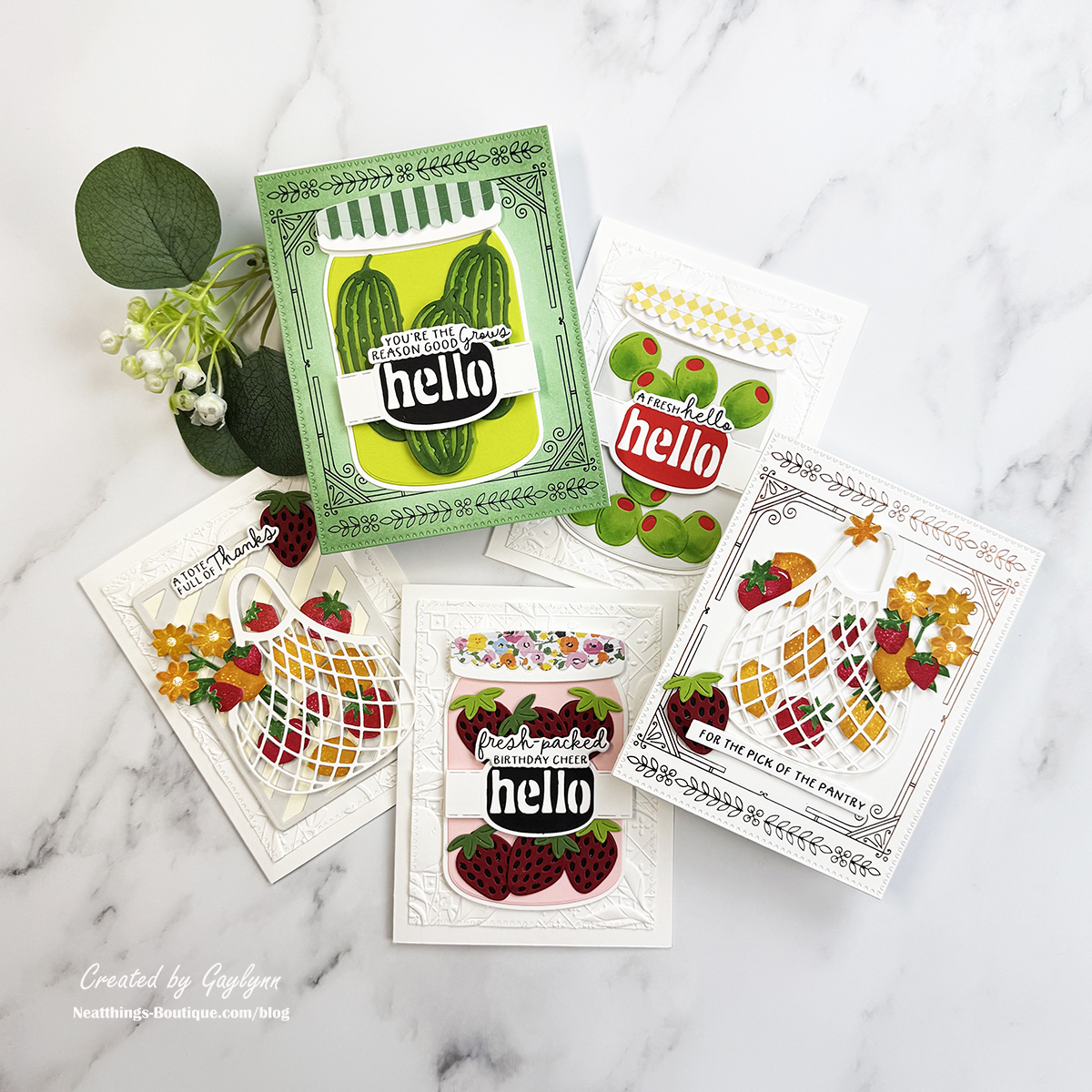 I used Club one of three bonus items called Market Jar Trio die cutting set, which is included in the April 2026 Farm To Craft All Clubs Crate. I made three canning jars for three of the cards using pickles, olives and strawberries. The sentiments all coordinate perfectly. See the full supply list and helpful tips below.