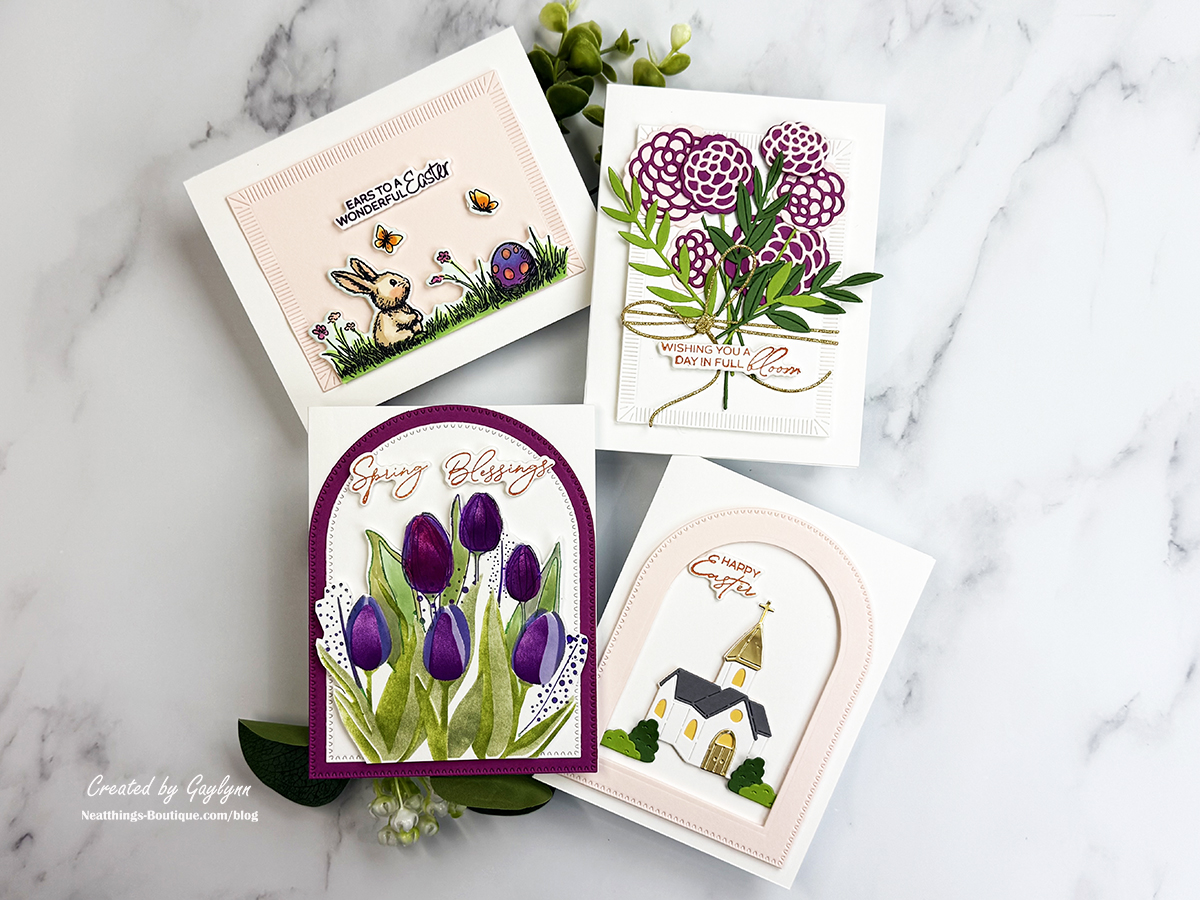 Using Arch dies and Rectangle dies and frames, assemble the four cards and their coordinating elements.