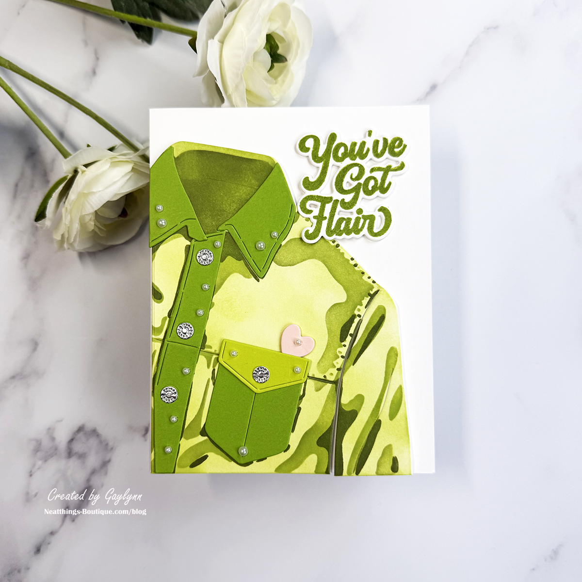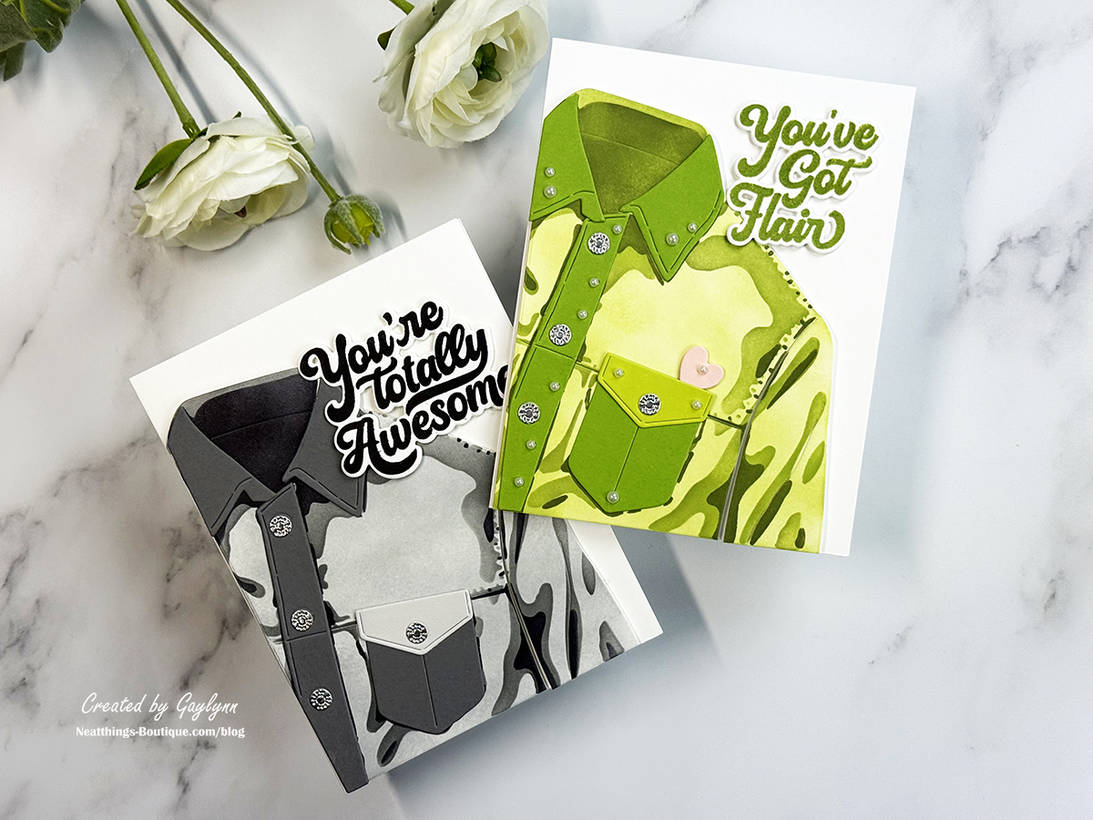 Good day! These are two super fun cards for guys and gals featuring a unique jean jacket design. I made two color variations, one more masculine in black and gray and one with greens, pearls and a pink heart for a feminine look. The products are from Hero Arts with a featured stencil and die set call Jean Jacket Bundle. There are items available individually, like the jean jacket stencil, the fab sentiment stamps & dies and more. These were fun and easy to make. To create these cards, I used stenciling, ink blending, colored cardstock, clear stamping and die-cutting. I include project tips, a short video and full supplies below.