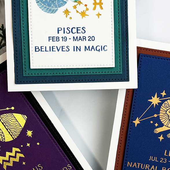 Hello everyone. I can finally share a peek at my projects using the newest Block Print Zodiacs Collection press and foil plates for Pisces, Leo and Aquarius Zodiac signs. I am today's guest designer on the Spellbinders Paper Arts blog. Visit me there for the projects, photos and steps to create three different Zodiac designs.
